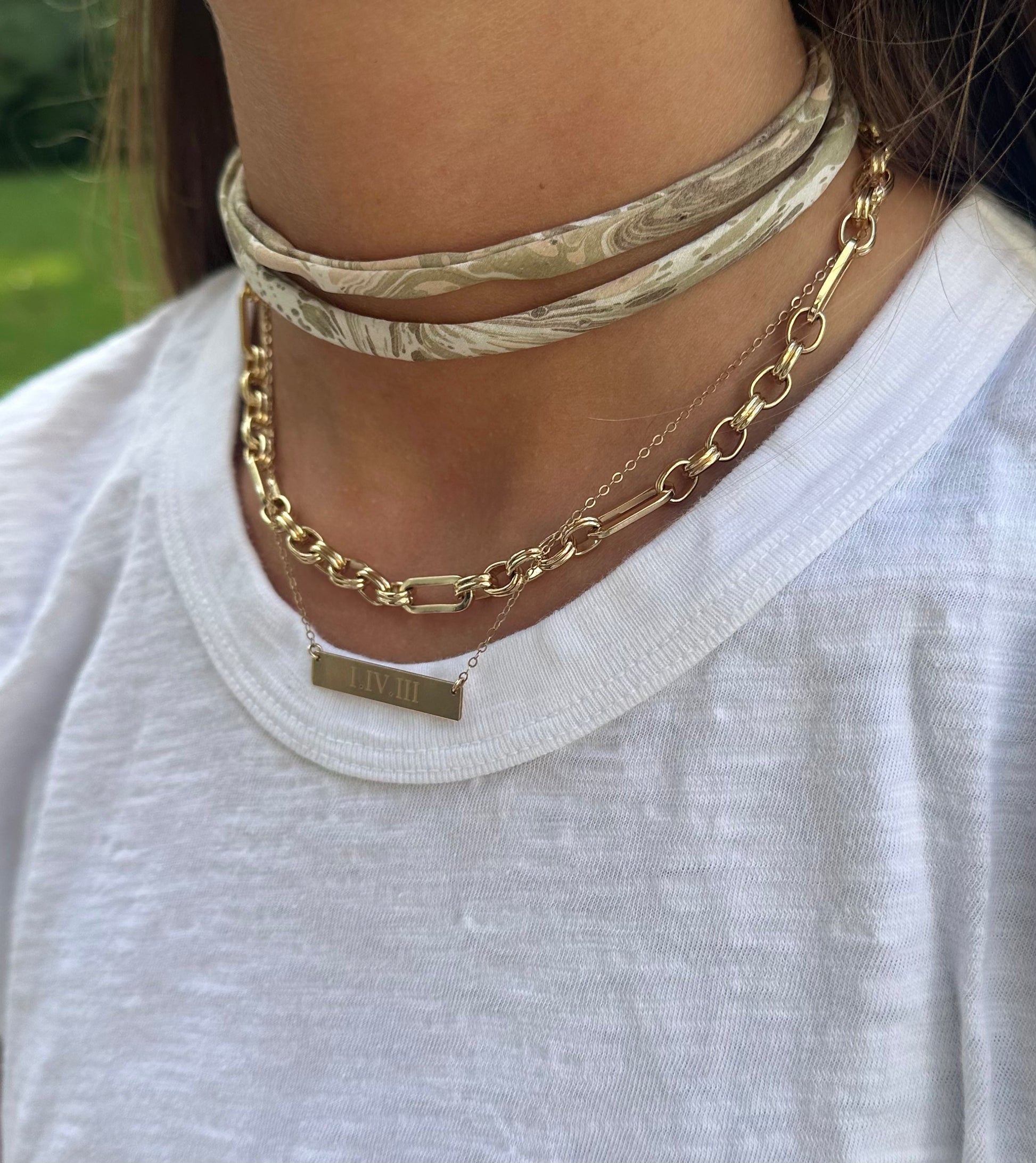 This design includes rich shades of dark green, white, and brown. Wear it to add a pop of color to any outfit, layer it to your necklace stack, or let it shine on its own. The adjustable tie-back closure makes it easy to style at the length you love — long and layered or doubled up as a choker.